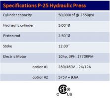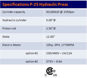 P-25 Hydraulic Press 25 tons C frame The P25, has a capacity of 25 tons. Perfect for all light duty jobs in your shop. Fast, simple, inexpensive the perfect light duty press for your repair shop. SPECIFICATIONS P-25 25 tons Hydraulic Press C frame