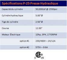 P-25 Presse hydraulique 25 tonnes châssis en C La P25 de VicRoc a une capacité de 25 tonnes. Parfait pour tous les travaux légers dans votre atelier. Rapide, simple, peu coûteuse, c’est la presse idéale pour plusieurs ateliers de réparation. P-25 Specifications