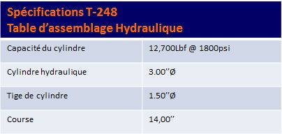 Cet étau hydraulique est indispensable pour la réparation des ressorts. Ses mâchoires sont munies de pièces trempées antidérapantes et le dessus de la table est équipé de rails de 1½ » de hauteur, facilitant ainsi la pose de collets, le réglage de lames et la pose du boulon de centre. La T-248 est équipée d’une cage de sécurité pour la protection de l’opérateur.
